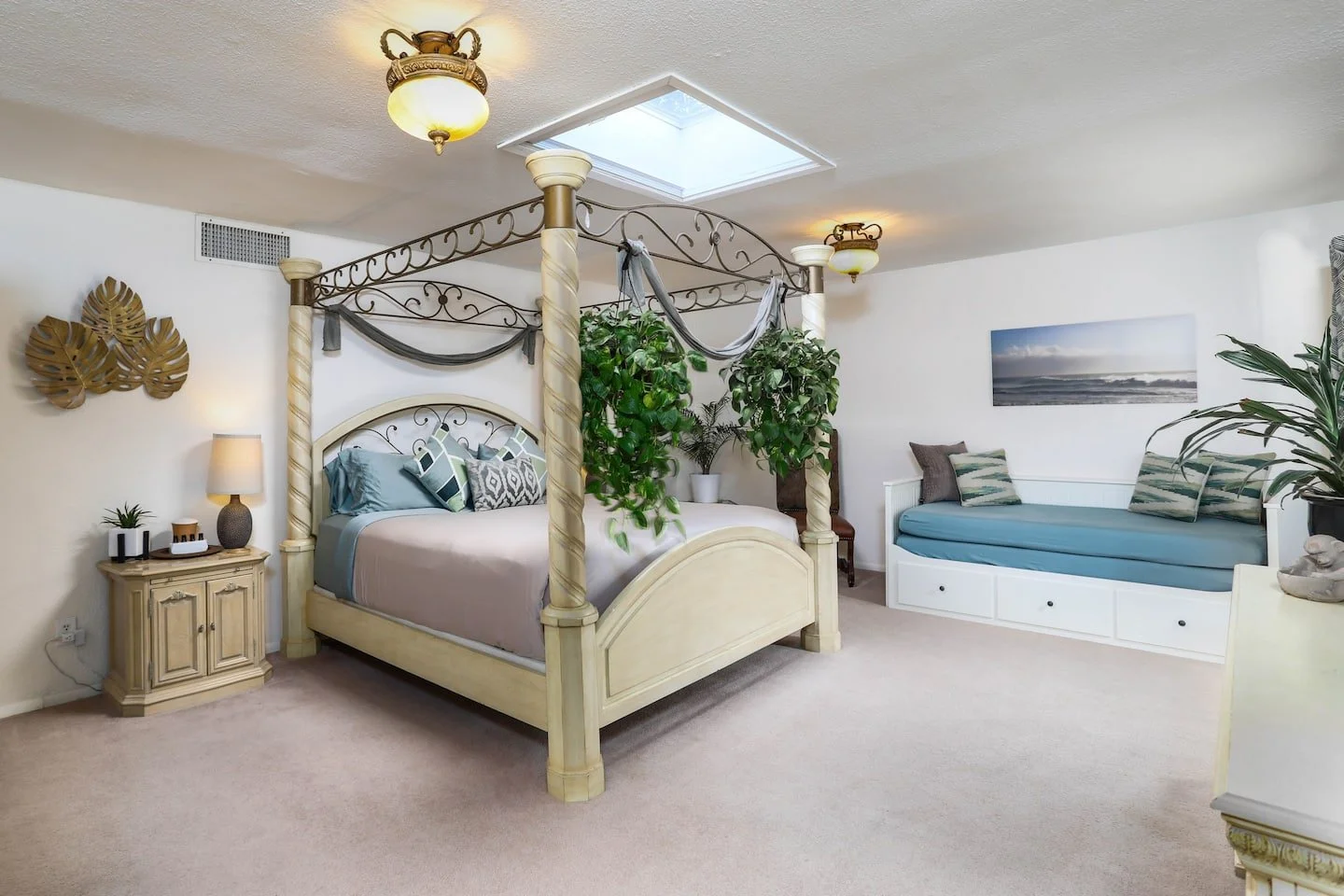 You must walk outside to access this bedroom. It shares one wall and vent with the bedroom with the canopy bed and plants.)